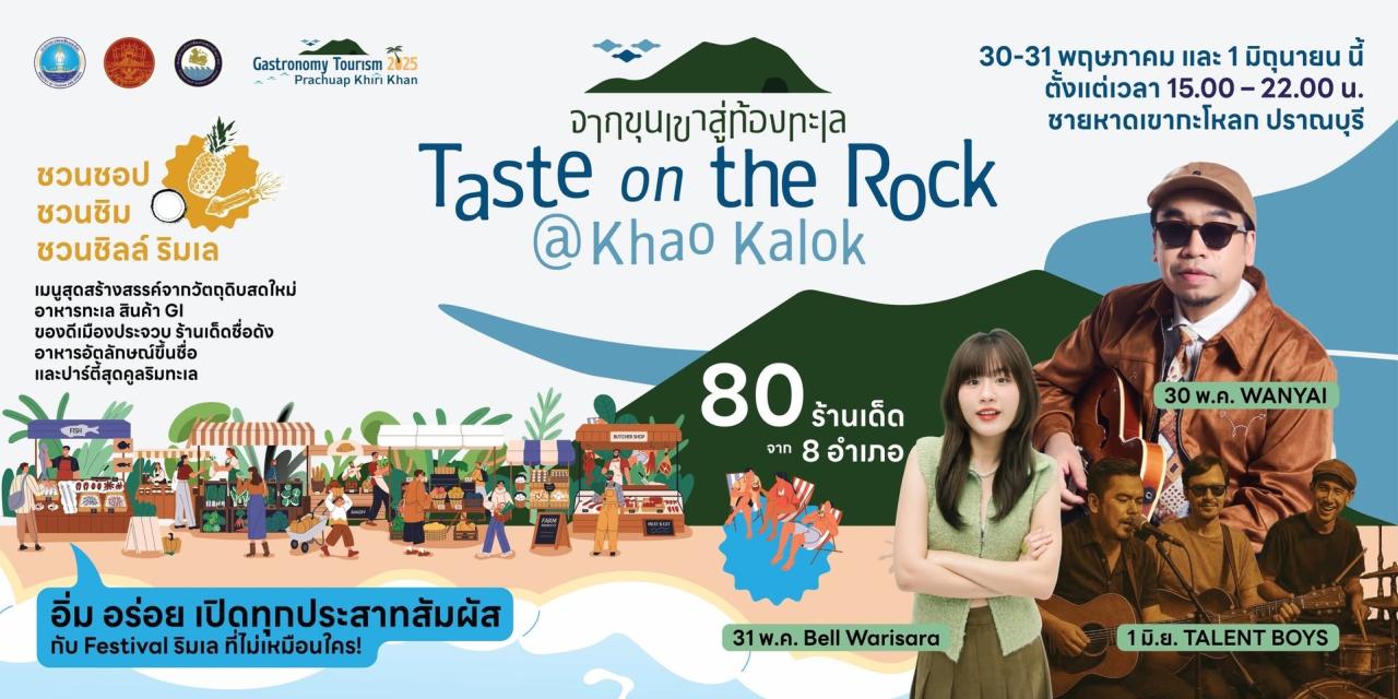 ระหว่างวันที่ 30-31 พฤษภาคม และ 1 มิถุนายน นี้ ตั้งแต่เวลา 15.00 น. ณ ชายหาดเขากะโหลก ปราณบุรี พบกับเมนูสุดสร้างสรรค์จากวัตถุดิบ อาหารทะเลสดใหม่ สินค้า GI ของดีเมืองประจวบ ร้านเด็ดชื่อดัง อาหารอัตลักษณ์พื้นถิ่น พร้อมกิจกรรม ปาร์ตี้สุดคูลริมทะเล Taste on the Rock – “จากขุนเขา...สู่ท้องทะเล” แล้วพบกันที่...ชายหาดเขากะโหลก!